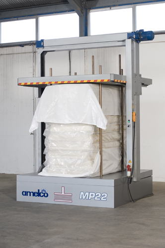 Guiding poles assist the mattresses during compression. After removing the poles, the 2 wrapping sheets are sewn together all around. The resulting bale can then be removed.